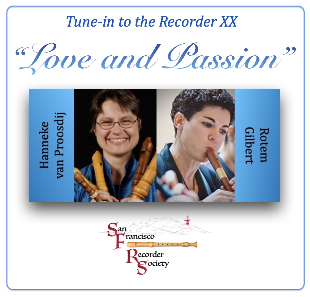 Registration is now open for The San Francisco Recorder Society's 20th annual recorder workshop, directed by the "dream team" of Hanneke van Proosdij and Rotem Gilbert on Presidents Day, Monday, February 16. This year's topic is "Love and Passion," intended to uplift us and offer connection and beauty through the music. Participation is open to recorder players and players of other "soft" instruments, such as harps and other plucked or bowed strings, and "soft" (not loud 😊) reeds. Two levels of participation: low-intermediate and high-intermediate/advanced players. We welcome first-time workshop attendees! Invite your recorder-loving friends and sign up now! Play for the full day or a half-day (morning or afternoon).
