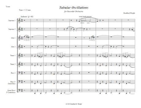 Tubular Oscillations is a piece for recorder orchestra characterized by various thematic waveforms, one of which is a half-step wave. Overall, the piece is upper intermediate to advanced level. Facility with scales containing B-flat, E-flat, and A-flat will be very helpful. The lower parts are somewhat easier. All parts have sections with difficult rhythms and/or fingerings, although an effort has been made to minimize this.