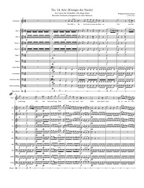 This arrangement was created using Mozart's own manuscript (available at imslp.org), and features the tiny sopranino recorder in the starring role. The vocal line runs throughout its entire range without any modifications needed, it fits perfectly on an F instrument. The top orchestral voice is Alto, so the sopranino can soar an octave above the rest.
