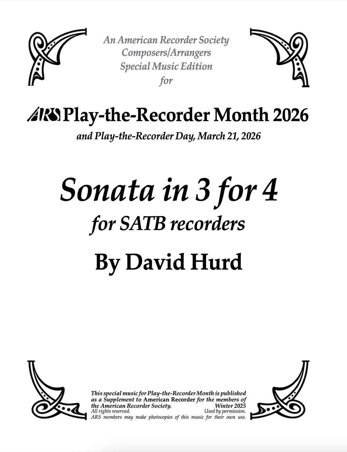 This Play-the-Recorder-Month composition was made possible by a generous donation from Wendy Powers, who writes “I am very pleased to sponsor David Hurd’s Sonata in 3 for 4 as the 2026 ARS Play-the Recorder Month Composition. I cannot wait to introduce this charming piece to student ensembles, combining exactly the right elements of fun and a bit of chromatic tanginess with accessibility within the idiom of the recorder consort. Thank you David!”