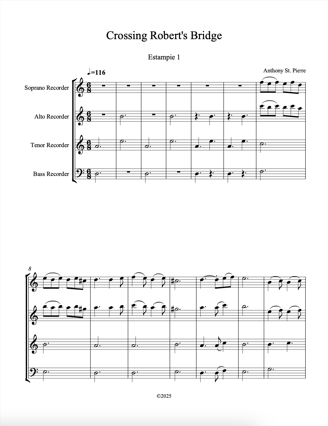 Here are two arrangements for SATB based on estampies from the Robertsbridge Codex of c.1360. The medieval sonorities are a refreshing surprise, contrasting well with harmonies more familiar to our modern ears. Parallel fourths, hockets and drones fill the air with a super-early vibe that's a lot of fun to play. A brisk tempo keeps things engaging, but look ahead to the fast patterns in Estampie 2 before settling on an overall tempo.