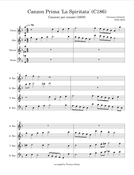 Four Canzoni in four parts by Giovanni Gabrieli (C186, C187, C188 and C189) appeared in Canzoni per sonare con ogni sorte di stromenti (Canzonas to be played on all sorts of instruments), a collection of 36 short works by various composers, published in 1608.